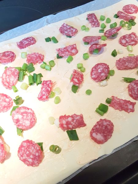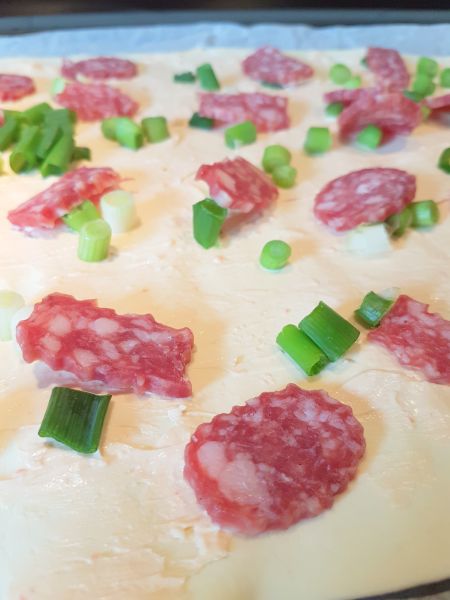 Im Anschluss belegt ihr den Frischkäse-Boden mit den Frühlingszwiebeln und der Salami.