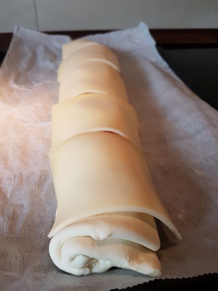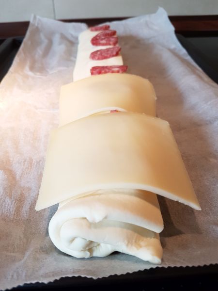 Danach rollt ihr das Ganze locker zusammen, bis eine Rolle entsteht. Auf die Rolle gebt ihr noch ein paar Salami-Scheiben und am Schluss belegt ihr die Blätterteigrolle mit Gouda, so dass alles bedeckt ist.