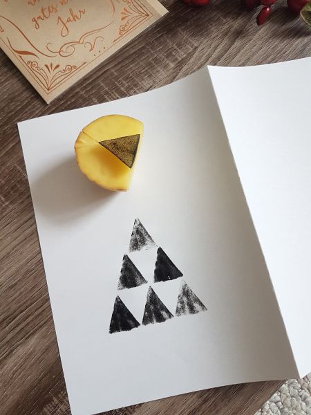 Diese werden dann mit einer Farbe eurer Wahl angemalt und aufs Papier gedruckt. Ich habe mich für Schwarz und Gold entschieden. Ich habe Acryl-Farbe verwendet, weil sie etwas dicker ist. Es klappt aber sicher auch mit anderen Farben. Zunächst habe ich die Dreiecke angemalt und die Kartoffel dann einmal auf ein Schmierpapier gedrückt, um die überflüssige Farbe abzustreifen. Sonst habt ihr nämlich zu viel Farbe und es schmiert auf dem Blatt. Außerdem wollte ich eine Optik erzeugen, die eher „used“ aussieht, das heißt es nicht komplett deckend ist. Das fand ich sehr schön. Rechts auf dem Bild habe ich nur Schwarz verwendet und links auf der Karte mit zwei Farben gearbeitet.