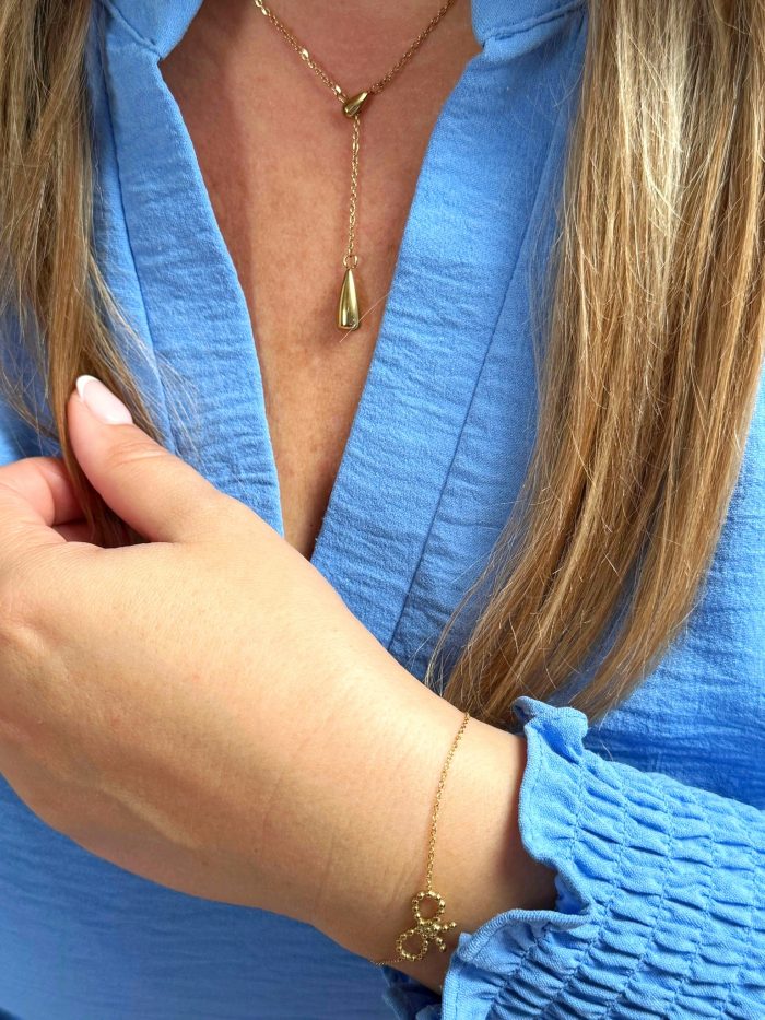 Ein weiterer großer Trend sind Y-Ketten, die ihren Namen der Y-förmigen Silhouette verdanken. Sie sind besonders beliebt, weil sie das Dekolleté optisch strecken und gleichzeitig subtil, aber wirkungsvoll Akzente setzen. Y-Ketten wirken sowohl in minimalistischen Designs – beispielsweise mit einer feinen Goldkette, die dezent endet – als auch in aufwendigeren Varianten mit funkelnden Anhängern oder Perlen. Meine Y-Kette, geformt wie ein Wassertropfen, ist aus hochwertigem, antiallergenem Edelstahl und veredelt mit einer langlebigen 14k Vergoldung.