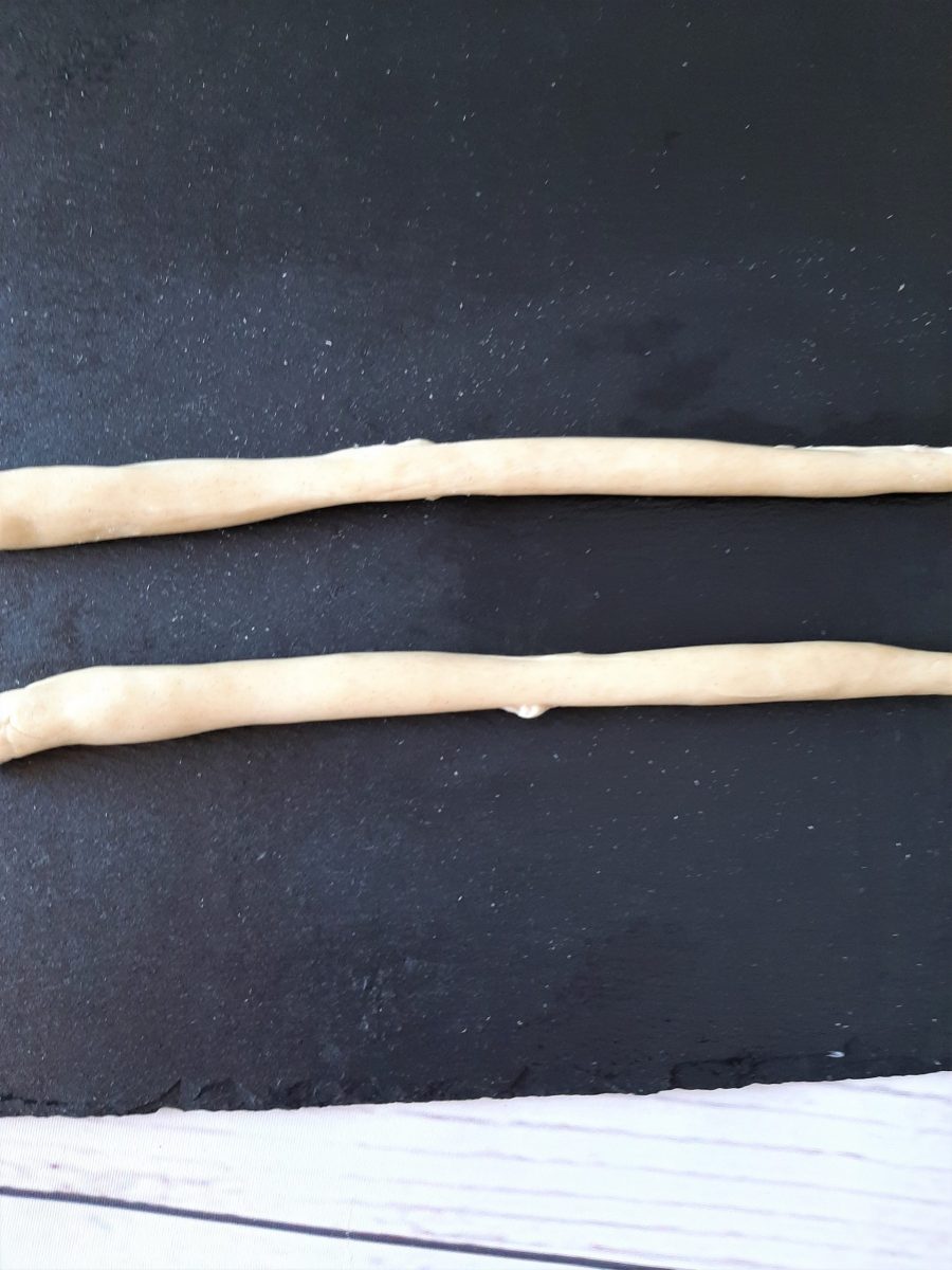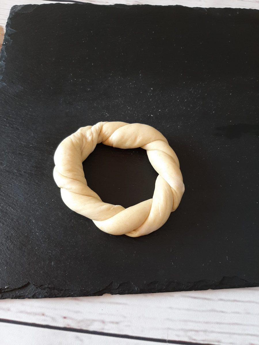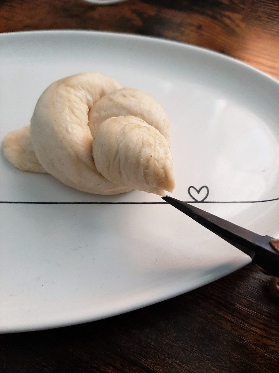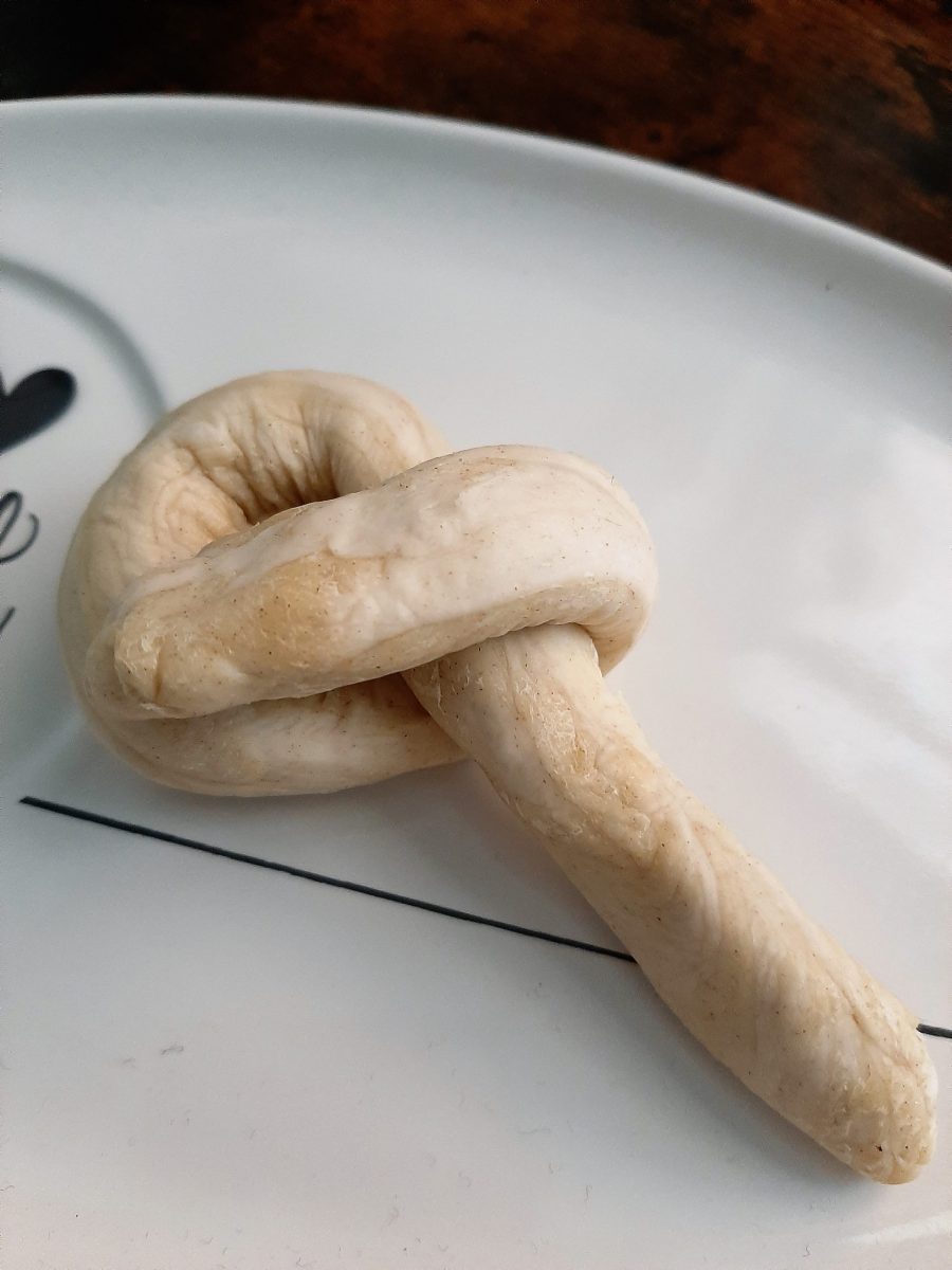 Variante 1: Ihr benötigt nur einen Teigstrang und eine Kugel, die in den Bauch kommt. Den Strang überkreuzt ihr einfach und dreht ihn dann einmal ein.
