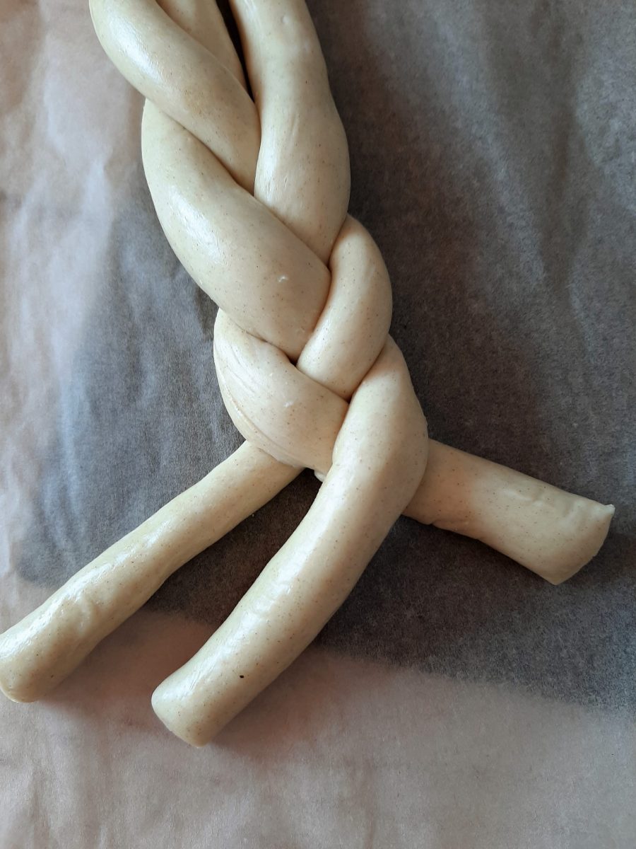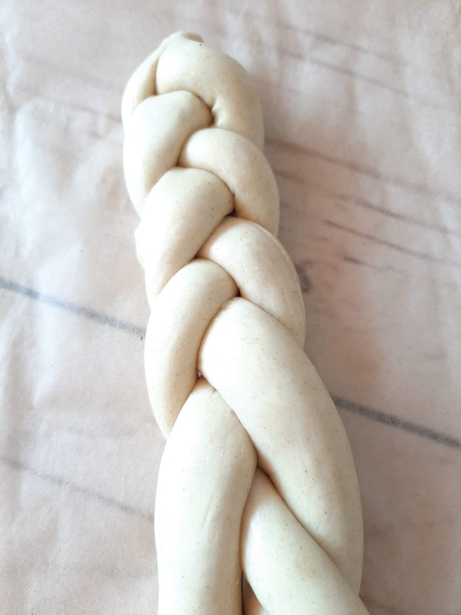 Als nächstes könnt ihr den Osterzopf formen. Dazu einfach drei gleichlange und -dicke Würste formen und diese flechten.