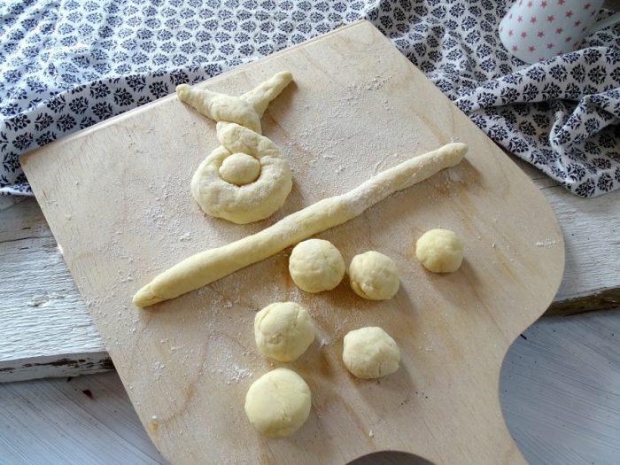 Den Teig in 8 – 12 Portionen teilen. Aus einem Teil eine Rolle („Wurst“) formen.