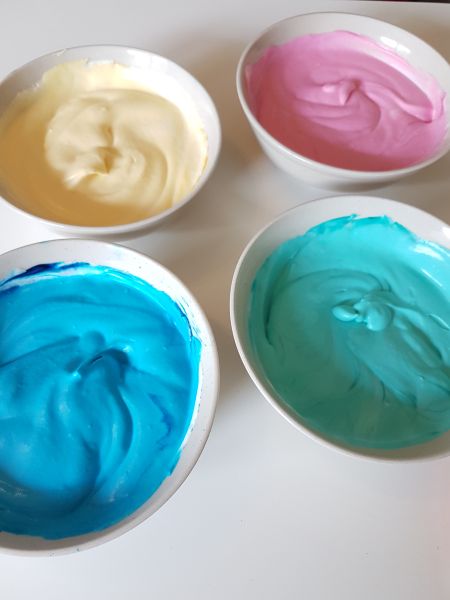 - Jetzt teilt ihr die Creme in 4 Teile. Jeder Teil wird mit einer anderen Farbe eingefärbt und gut verrührt.