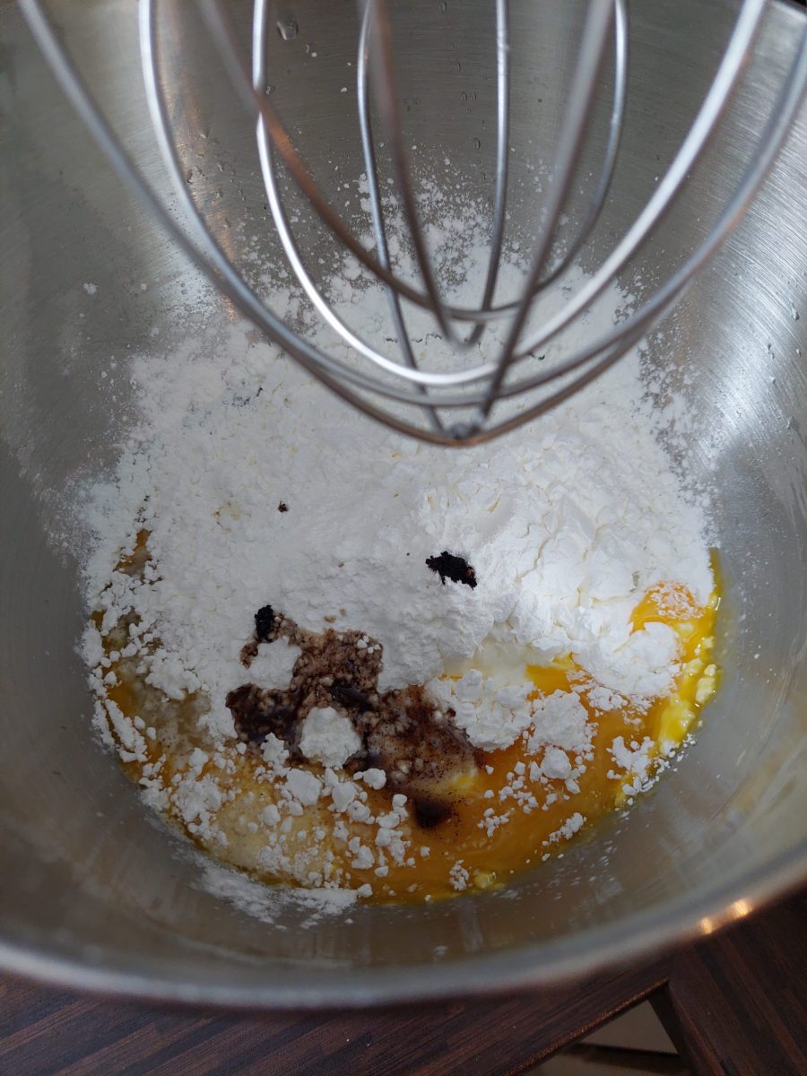 Zunächst trennt ihr das Eigelb vom Eiweiß und schlagt das Eiweiß steif. Lasst es dann in einer separaten Schüssel stehen. Zum Eigelb gebt ihr alle restlichen Zutaten (Joghurt, Vanilleschote, Vanillinzucker, Stärke, Backpulver und Zucker) und verrührt das Ganze mit einem Rührgerät zu einer glatten Masse.