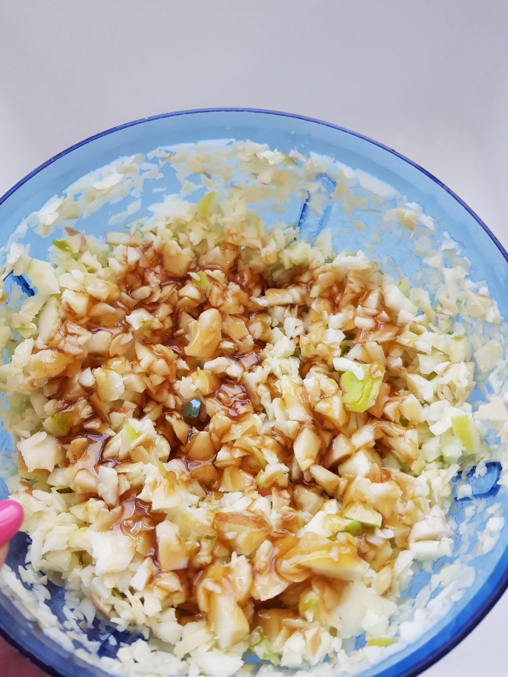 Äpfel mit Mandeln Äpfel mit Honig und Mandeln - Danach die Apfelmischung gut unterheben und verrühren. Schmeckt bitte den Teig nochmal ab, eventuell gebt ihr noch mehr Honig dazu. Zum Schluss die Butter hinzugeben und nochmals umrühren.