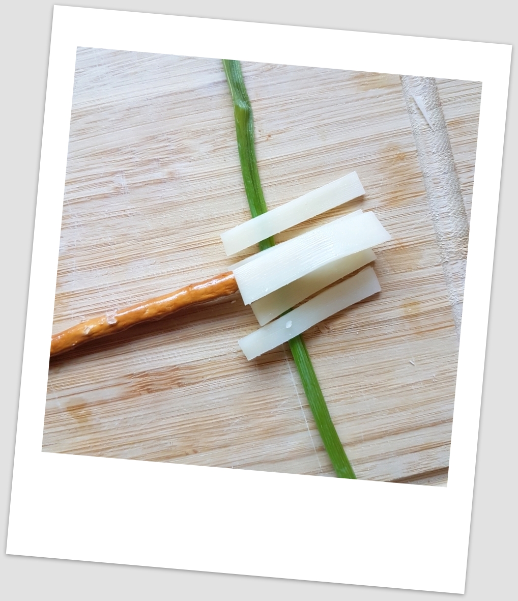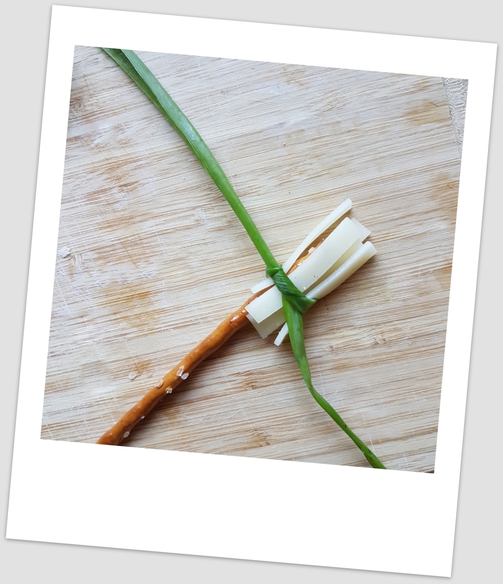 Die Hexenbesen sind recht schnell zubereitet. Ihr schneidet zunächst eine Scheibe Gouda in viele kleine Streifen, die gleich lang sein sollten. Dann legt ihr die Streifen um eine Salzstange und bindet es mit einem Schnittlauch zu.