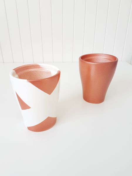 Zunächst starten wir mit den weißen Vasen, die einen Lackanstrich bekommen. Einmal mit und einmal ohne Muster. Für das Muster benötigt ihr das Krepp-Klebeband und klebt immer abwechselnd einen Streifen des Klebebandes auf die Vase. Die Klebestreifen sollen sich überkreuzen, so dass kleine Dreiecke entstehen. Dann geht ihr am Besten in den Garten, legt eine Zeitung unter und beginnt die Vasen aus einem Abstand von ca. 20 cm zu besprühen. Das Ganze trocknet recht schnell, aber ich habe es über Nacht stehengelassen, damit es völlig austrocknet.